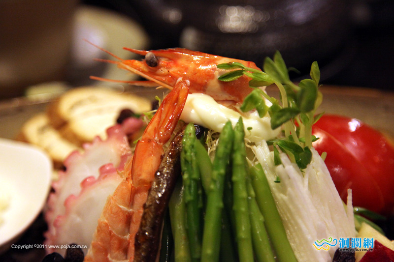 綜合沙拉裡包含蝦子、章魚、魚蛋及蔬果,口感清爽健康,兼具營養均衡,是理想的開胃前菜。