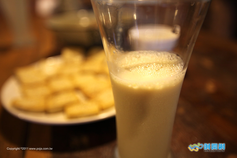 這就是使用鹽滷水取代石灰所製作的豆漿,很濃郁也很養生喔