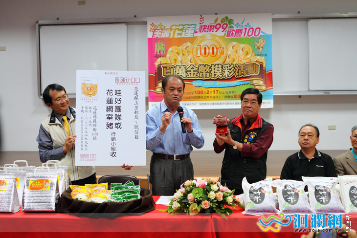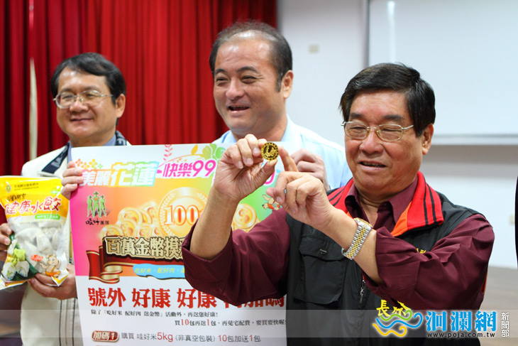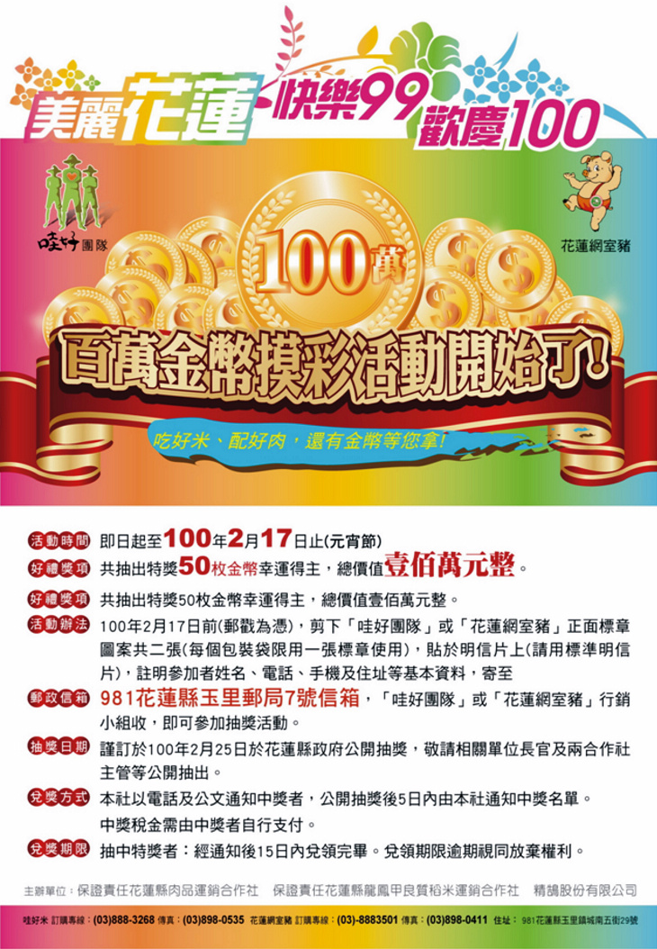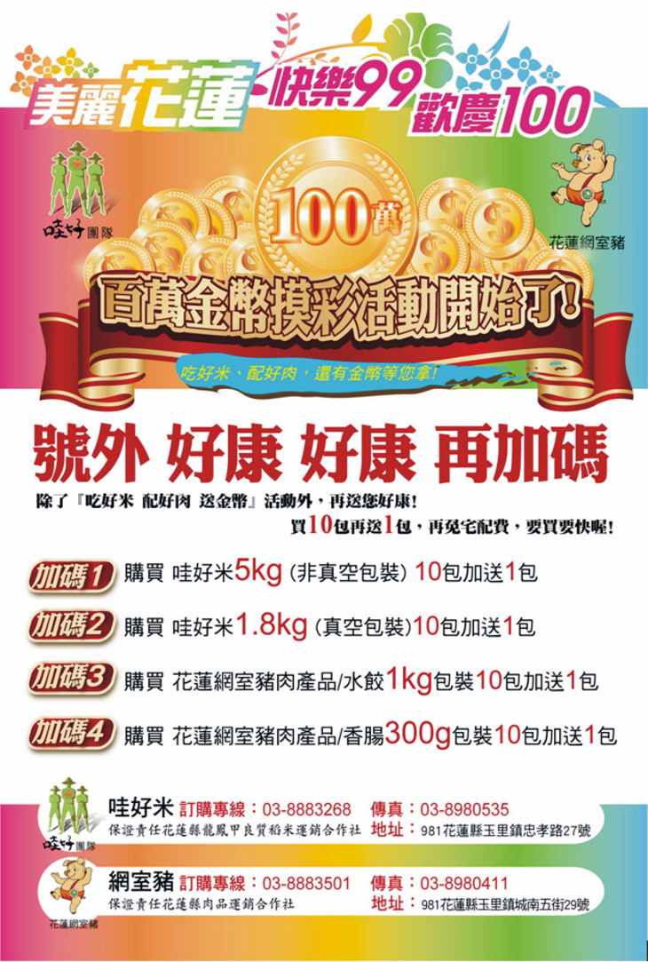 美麗花蓮 快樂久久 歡慶一百,吃好米 配好肉 還有 金幣 等您拿 「 哇好米」是龍鳳甲運銷合作社主要的商品,原料來自全國良質米最大產區的玉里、卓溪 ( 自 4,200 公頃中精選 100 公頃製成的 - 哇好 米 ) 自去年辦理「 呷好米 送名車 」後成功的 打響米界市場,今日為農友 99 年二期新米即將收割之季,特別再與肉品合作社聯手辦理 「 吃好米 配好肉 送金幣 」活動,希望好運的您快樂久久 歡慶一百。