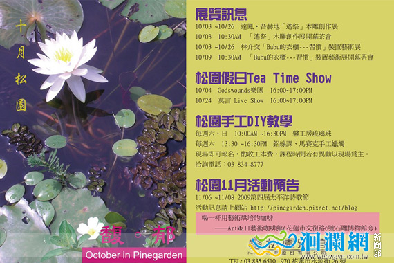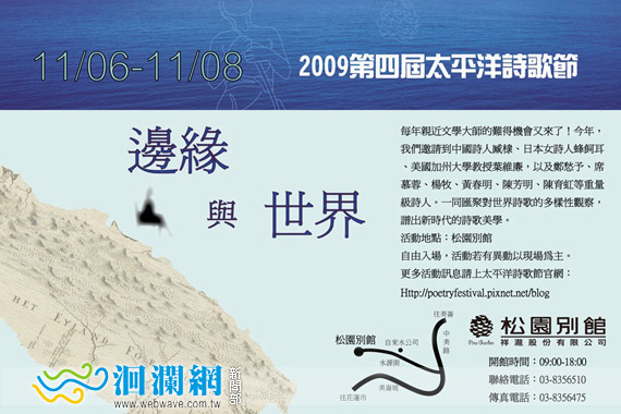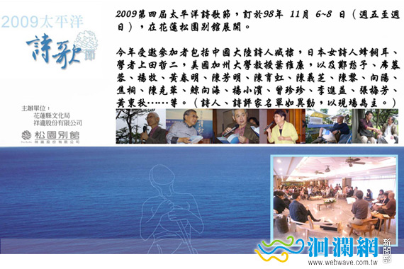 您當前的位置:首頁 > 花蓮新聞 > 熱門活動 2009 第四屆太平洋詩歌節 時間:2009-09-26 16:21:13 來源:松源別館 作者:楊均濰 瀏覽人數: 字級 S M L 今年度的太平洋詩歌節又即將展開囉!~十一月「第四屆太平洋詩歌節」,邀請了中國詩人臧棣、日本女詩人蜂飼耳、美國加州大學教授葉維廉,以及鄭愁予、席慕蓉、楊牧、黃春明、陳芳明、陳育虹、陳義芝、陳黎、向陽、焦桐、陳克華、鯨向海、楊小濱等國內外重量級詩人,以「邊緣與世界」為主題,匯聚國內外詩人對世界詩歌的觀察,共同譜出新時代的詩歌美學。有機會就多到松園走走吧~