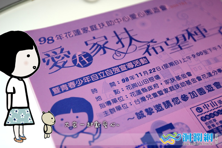 花蓮家扶中心預定於98年11月22日在花蓮市花崗山田徑場推出「愛在家扶‧希望種子」歲末愛心園遊會暨青春少年自立自強宣導活動,為了凝聚社會大眾的愛心共同關懷弱勢家庭的年幼孩童健康成長並助其如願求學,繼公開甄選園遊券刊載的「愛心商店」之後,第二波的愛心攤位召集與受理民眾認購園遊券的事前籌備工作,正如火如荼進行中,歡迎社會各界共襄盛舉,洽詢電話:03-8236005。
