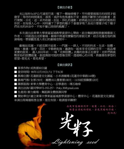 者,一同創造出光籽劇場。劇場中將運用實驗性的原創元素,結合花蓮在地的展演場地,