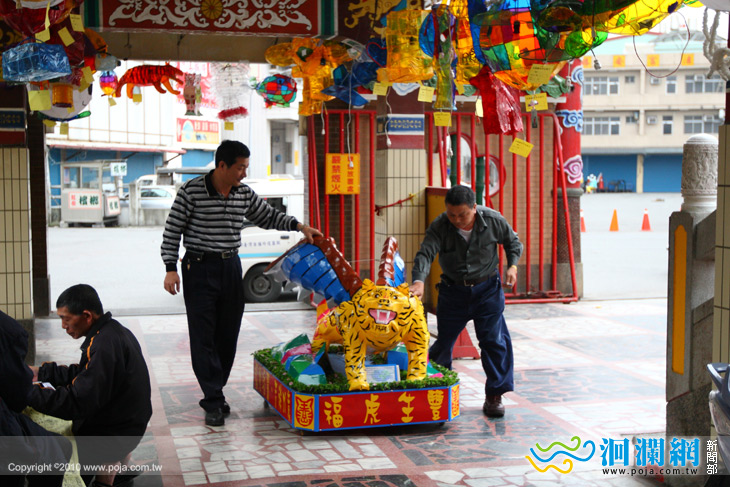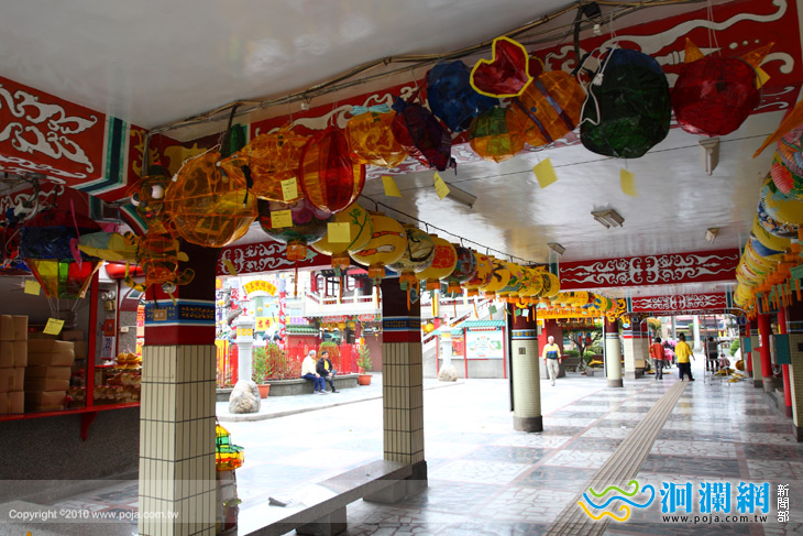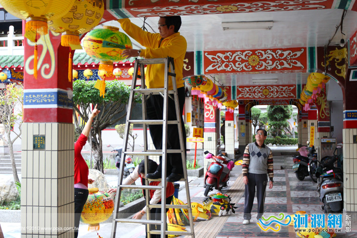 目前勝安宮的工作人員正加緊腳步忙著將花燈掉掛上去.