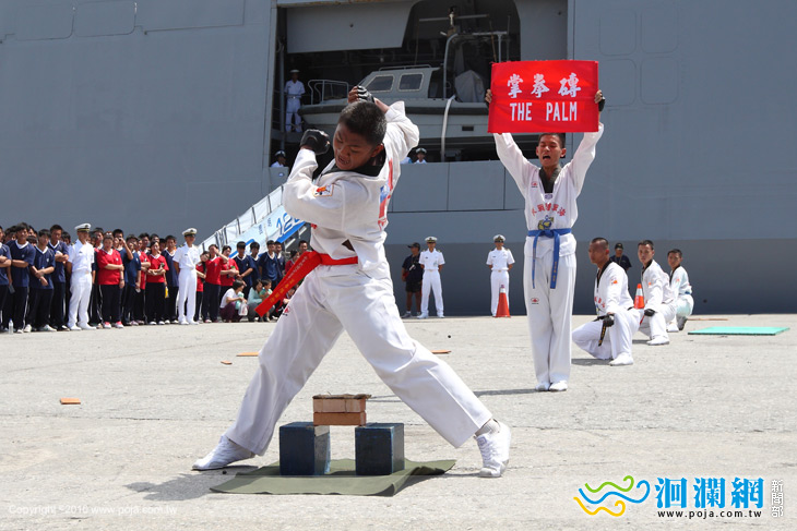 鼓號樂隊、儀隊操槍表演,讓現場民眾看的目不轉晴,莒拳隊員屢屢擊破磚塊、