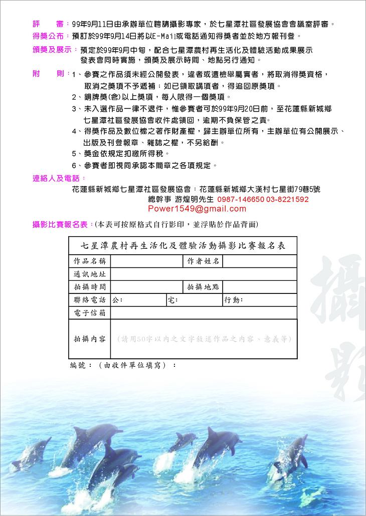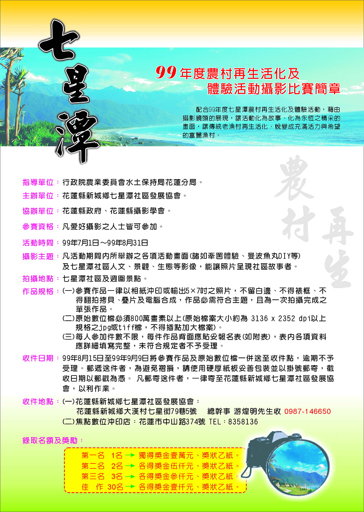 您當前的位置:首頁 > 花蓮新聞 > 熱門活動 99年度農七星潭村再生活化及體驗活動攝影比賽 時間:2010-07-02 14:27:23 來源:七星潭社區發展協會 作者:楊均濰 瀏覽人數: 字級 S M L 洄瀾網 |記者| 楊均濰/整理