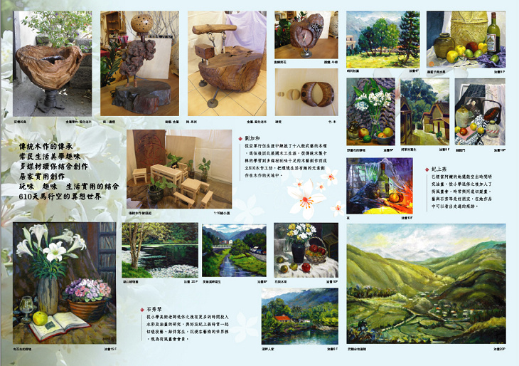 本次展出項目有油畫紀上燕﹑石秀琴作品大多以花蓮風景寫生及常民生活、食衣住行所用所見的東西為題材