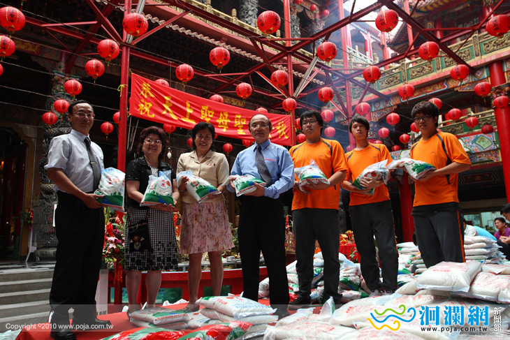 花蓮港天宮為慶祝天上聖母湄州大媽壽誕,以善心人士捐助的五千公斤共計 1008 包的白米堆砌成