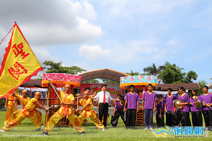 「鑼聲鼓聲慶鄉里」;而富源社區隊伍身穿紫色服飾,頂著天藍色的轎頭,轎上右聯寫著
