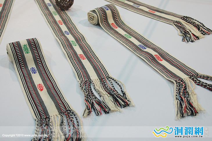 現場展示太魯閣族編織好手胡秀蘭與胡俊傑母子檔的精緻編織工藝,每件作品不但保有原住民傳統圖騰及技法,
