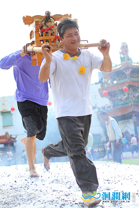 時辰一到,炭火兩旁開始灑米灑鹽驅邪,在令旗的帶領下所有扛轎信眾赤腳衝過烈焰炭火,神轎過火儀式中,