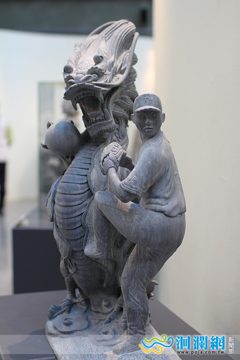 鄭詠鐸特別介紹這一件子己非常喜愛的作品,本身就是個王建民的球迷,非常熱愛王建面民而特別雕刻了王進民投球