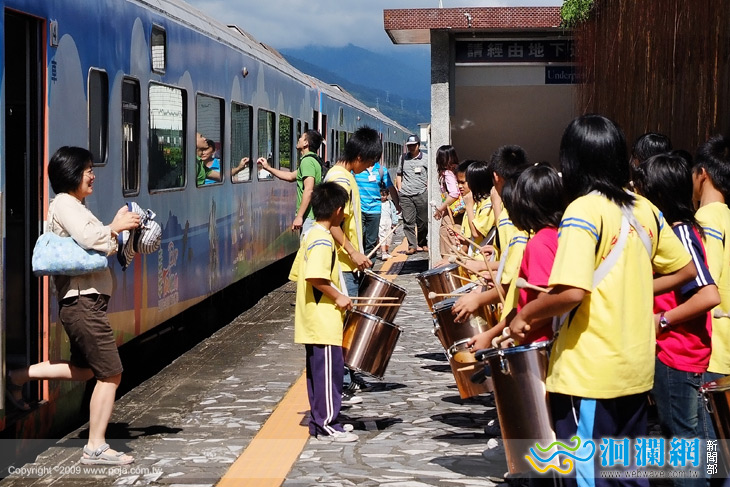 瑞穗溫泉觀光協會理事長陳廖安等人與地方各界在花蓮瑞穗火車站第一月台迎接首批由台北搭乘郵輪式列車之300名遊客,