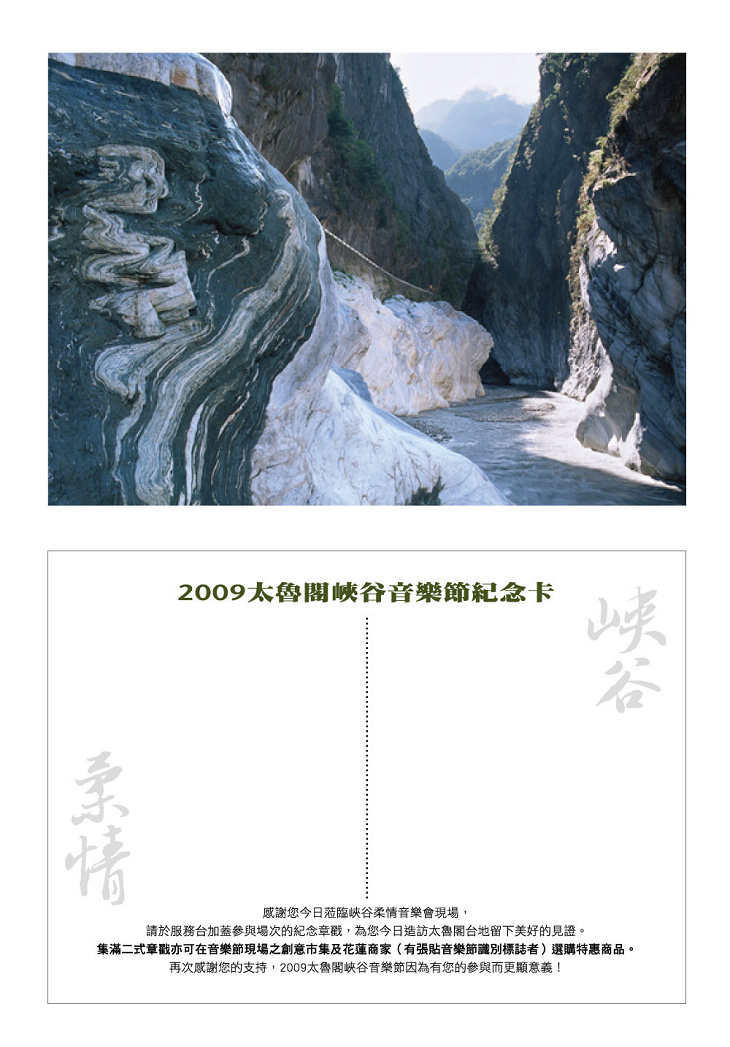 太魯閣峽谷音樂節不僅節目好看、好聽,也可免費帶回加蓋峽谷音樂節專屬紀念章戳的卡片,憑著卡片還可在花蓮商家享食宿、伴手禮的優惠。 為了使欣賞峽谷音樂節的民眾帶回美好的記憶,承辦單位特別設計「峽谷音樂節紀念卡片」,卡片還可加蓋音樂節專屬紀念章,值得珍藏紀念。只要11月28日峽谷音樂節當天,在活動現場服務台即可免費索取蓋章,每人限量一張。 除此之外,今年峽谷音樂節還特別結合數十家花蓮的名產、飯店、航空站、航空公司、旅行社、旅遊網站推出各項優惠措施,只要憑蓋有紀念章的「峽谷音樂節紀念卡」,到貼有「太魯閣峽谷音樂節優惠店家」貼紙的商家,即可享有食宿、選購伴手禮的優惠。 太魯閣國家公園管理處表示,連續舉辦8年的太魯閣峽谷音樂節,已成為花蓮的盛事,建議民眾除了欣賞好聽的音樂會外,也能在花蓮多停留一天,進入太魯閣國家公園體驗自然美景,也歡迎選購花蓮伴手禮分享親友。 |