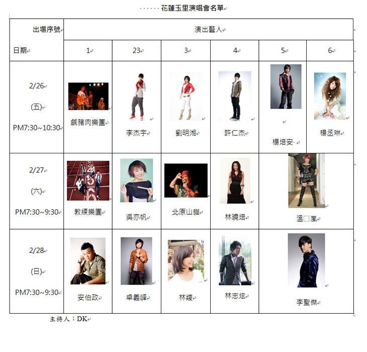 您當前的位置:首頁 > 花蓮新聞 > 旅遊資訊 太平洋國際觀光節.明天玉里加碼登場 時間:2010-02-25 11:00:29 來源:花蓮縣政府 作者:楊均濰 瀏覽人數: 字級 S M L 2/26-2/28 花蓮玉里加演三場 嘉惠花蓮南區民眾 讓15天15夜熱度持續延燒!! 玉里加演節目表:2/26(五) 鹹豬肉樂團/李杰宇/劉明湘/許仁傑/楊培安/楊丞琳 2/27(六) 教練樂團/吳亦帆/北原山貓/林曉培/溫嵐 2/28(日) 安伯政/林綾/卓義峰/林志炫/李聖傑 位置圖:資料來源:花蓮縣政府