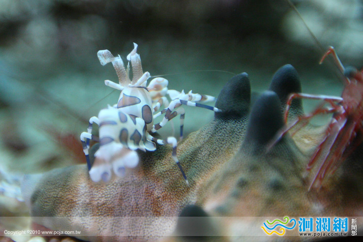 身長約5至6公分的可愛小蝦,有著一對與身體同寬的大螯,雪白的身子佈滿紫藍色或粉紅色的斑點,