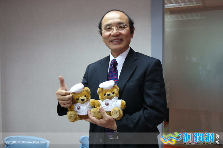 (李校長手裡拿著繡有台灣觀光學院的吉祥物小熊.將贈予此次參加來賓)