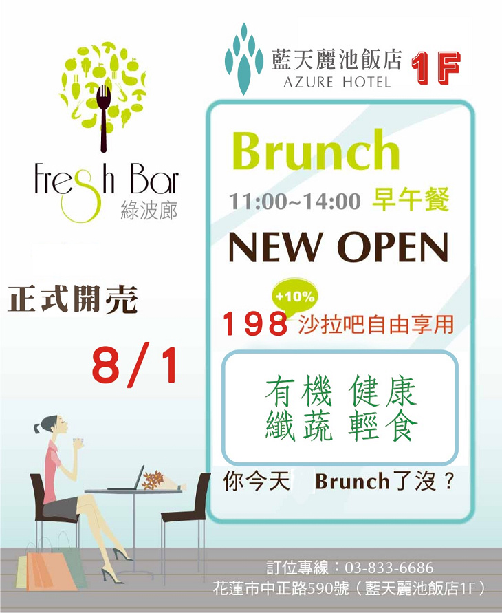 您當前的位置:首頁 > 花蓮新聞 > 旅遊資訊 藍天麗池 全新綠波廊餐廳 8/1 正式開賣 時間:2010-07-30 13:01:20 來源:藍天麗池飯店 作者:楊均濰 瀏覽人數: 字級 S M L 藍天麗池 一樓全新綠波廊餐廳正式開賣~Brunch早午餐 11:00~14:00198元+10% 沙拉吧自由享用~有機/健康/纖蔬/輕時全新環境全新享受~洄瀾網 |記者| 楊均濰/整理