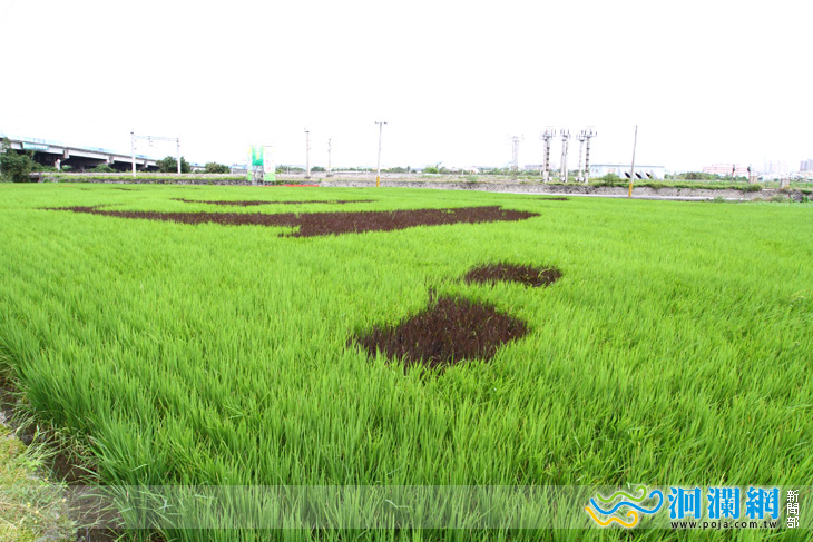 這片彩色稻田位於花蓮市國強里新生橋旁,面積約1公頃,市農會已於8月中旬先以人工插秧方式將圖騰部分