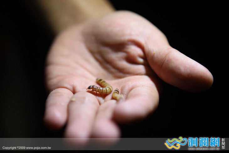 飼養員大哥將手中的蟲蟲放在預設好的樹葉上讓高射炮射食.
