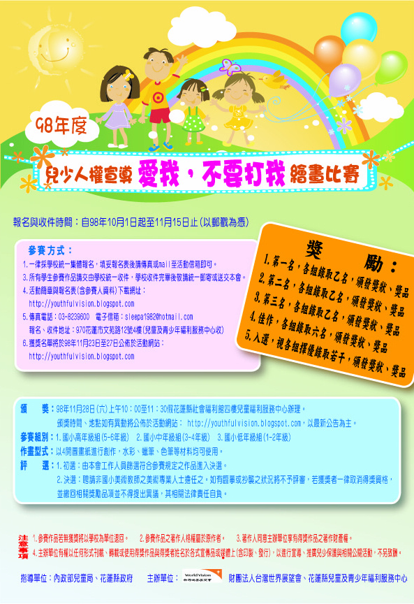 四、 頒獎:98年11月28日(六)上午10:00至11:30假花蓮縣社會福 利館四樓兒童福利服務中心辦理。頒獎時間、地點如有異動將公佈於活動網站:http://youthfulvision.blogspot.com,以最新公告為主。