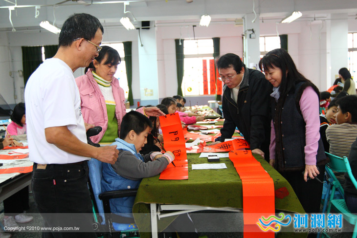 中年級寫四字吉祥話,高年級則寫對聯,參加的學生和義工家長們都興致盎然,兩位坐輪椅的小朋友不落人後更是令人感動,