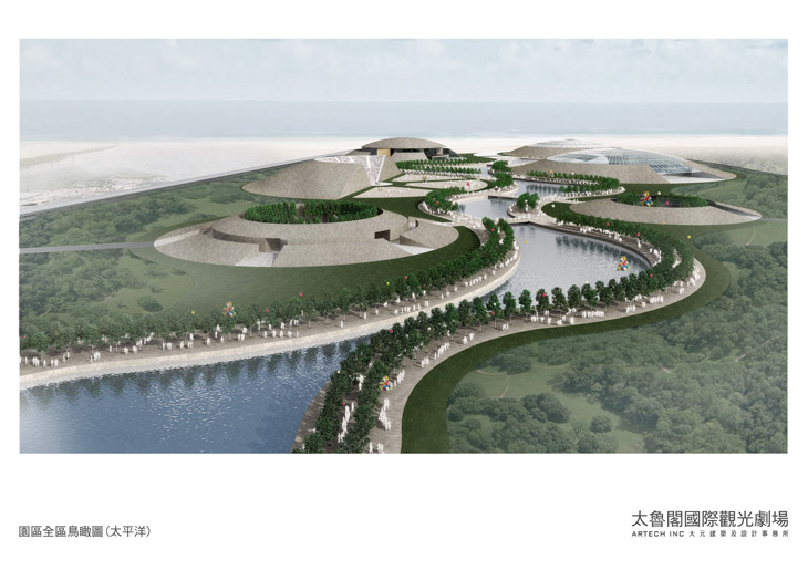 築構成,建物間有人工河流貫穿,土丘是模擬群山起伏,水景溪流是回應清澈碧藍的立霧溪,整體呈現
