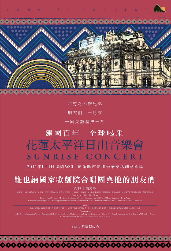 其次,「花蓮精彩100 巨星演唱會」選定在花蓮市六期重劃區舉行,元旦升旗典禮、「花蓮太平洋日出音樂會 維也納