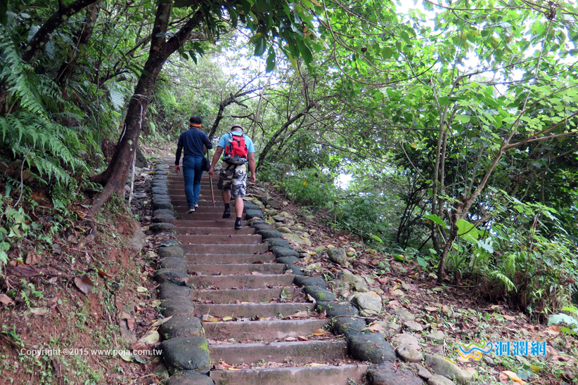 沿著山坡慢慢的往上走,有時是石頭堆砌的階梯,有時是平緩的碎石步道