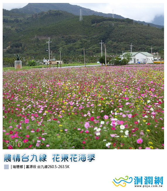 您當前的位置:首頁 > 花蓮旅遊 > 縱谷線南端 [影音]花東花海季-瑞穗富源 時間:2010-01-13 13:35:47 來源:洄瀾網 作者:楊均濰 瀏覽人數: 字級 S M L 位於瑞穗台九線富源段260.5-263.5公里處的花海景觀常是過路遊客駐足的地點之一.沿線兩旁種滿了茂密的波斯菊花海.此處最常見的花種是以向日葵最為吸引遊客.一朵朵向日葵花對著燦爛的豔陽微笑著.彷彿再開一場派對般熱鬧.路邊可以見到一個大鳳梨的裝置藝術品為地標相當好認唷~鄰近景點:| 瑞穗牧場 | 舞鶴茶園 | 鶴岡文旦 | 瑞穗溫泉區 | 蝴蝶谷 |如看不見地圖.請在地圖上重新整理